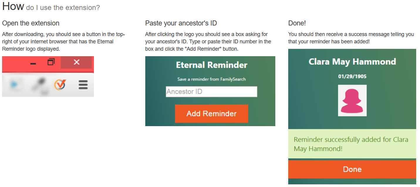 Once installed, you’ll see an Eternal Reminder button at the top of your browser. When you are viewing an ancestor in FamilySearch, you can click the button, enter their FamilySearch ID, and create a reminder instantly. It works exactly like the website version and will send you an email on your ancestor’s 110th birthday.