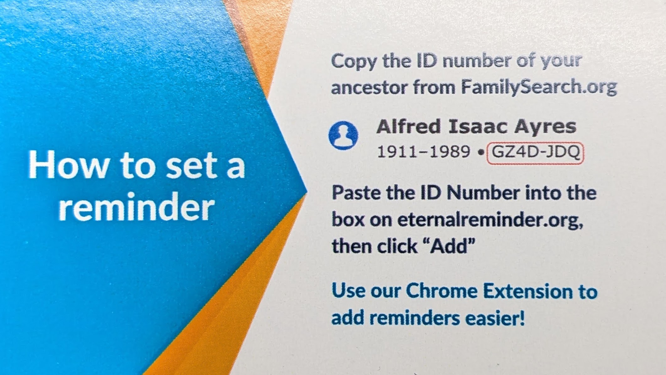 We offer free pass-along cards that you can hand out to friends, family, or members of your ward. These small cards are an easy way to introduce others to Eternal Reminder and explain what it does.